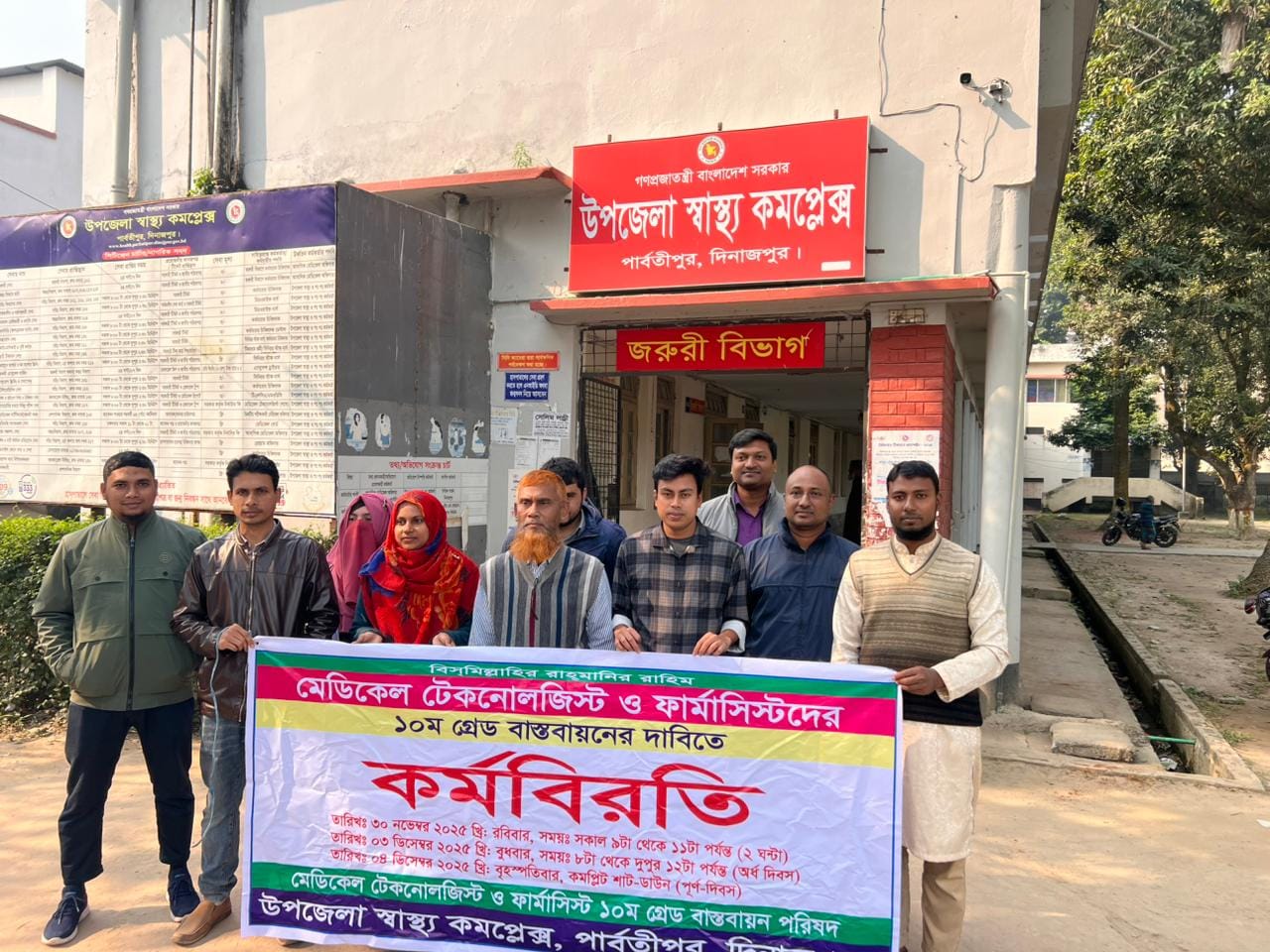 পার্বতীপুর উপজেলা প্রতিনিধিঃ সারাদেশের ন্যায় " মেডিকেল টেকনোলজিস্ট ও ফার্মাসিস্ট ১০ ম গ্রেড বাস্তবায়ন পরিষদ " এর কেন্দ্রীয় কর্মসূচি মোতাবেক ৪ ঘন্টা কর্মবিরতি পালন করেছেন দিনাজপুরের পার্বতীপুর উপজেলা স্বাস্থ্য কমপ্লেক্সে কর্মরত মেডিকেল টেকনোলজিস্ট ও ফার্মাসিস্ট রা। আজ ৩ রা ডিসেম্বর বুধবার সকাল ৮ টা থেকে দুপুর ১২ টা পর্যন্ত এই কর্মবিরতির কর্মসূচি পালন করেন তারা।