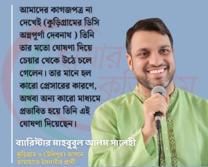 কুড়িগ্রাম থেকে মোস্তাফিজুর রহমান : ০৪ জানুয়ারী ২০২৬, আন্তর্জাতিক খ্যাতিসম্পন্ন আইনজীবী ব্যারিস্টার মাহবুবুল আলম সালেহী জামায়াতের হেভিওয়েট প্রার্থী কুড়িগ্রাম-০৩ আসনের সংসদ সদস্য প্রার্থী হিসেবে সকল প্রকার প্রয়োজনীয় কাগজপত্র এবং দ্বৈত নাগরিকত্বের আইনী কাগজপত্রসহ মনোনয়নপত্র জমা দেওয়া হলেও তাতে সন্তুষ্ট না হয়ে সংক্ষুব্ধ হয়ে কুড়িগ্রামের জেলা প্রশাসক ও জেলা রিটার্নিং কর্মকর্তা অন্নপূর্ণা দেবনাথ ব্যারিস্টার মাহবুবুল আলম সালেহীর মনোনয়ন স্থগিত করে শুক্রবার। এরপর জেলা প্রশাসক ৪ জানুয়ারী রোববার বিকেল পর্যন্ত সময় দিয়ে আরও প্রয়োজনীয় কাগজপত্র নিয়ে ডাকেন। জানা যায়- সে মোতাবেক রোববার দুপুর সাড়ে ১২টার দিকে জেলা জামায়াতের আমীর অধ্যাপক আজিজুর রহমান সরকার স্বপন জেলা জামায়াতের সেক্রেটারী মাওলানা মোঃ নিজাম উদ্দিন, কুড়িগ্রাম জেলা আইনজীবী সমিতির সাবেক সাধারণ সম্পাদক ও সভাপতি অ্যাডঃ ইয়াছিন আলী সরকার, সিনিয়র আইনজীবী অ্যাডঃ রেজাউল করিম নয়ন সহ নেতৃবৃন্দকে সাথে নিয়ে কুড়িগ্রাম-৩ আসনের জন্য জামায়াতের মনোনীত সংসদ সদস্য প্রার্থী সাবেক কেন্দ্রীয় ছাত্রনেতা ব্যারিস্টার মাহবুবুল আলম সালেহী জেলা প্রশাসকের কার্যালয়ের সম্মেলন কক্ষে উপস্থিত হন এবং কাগজপত্র দেখতে অনুরোধ করেন। জেলা প্রশাসক ও জেলা রিটার্নিং কর্মকর্তা অন্নপূর্ণা দেবনাথ ব্যারিস্টার সালেহীর কাগজপত্র না দেখেই তিনি সালেহীর উদ্দেশ্যে বলেন দেখার দরকার নেই স্থগিত করা মনোনয়ন বাতিল করা হলো। তখন জামায়াতের আমীর অধ্যাপক আজিজুর রহমান সরকার স্বপন জানতে চাইলে ডিসি তার সন্তোষজনক জবাব না দিয়েই ডিসি ঘটনাস্থল ত্যাগ করেন। এরপর সকালে জেলা জামায়াতের অফিসে এসে তাত্ক্ষণিকভাবে আলোচনা করে আপিলের সিদ্ধান্ত নেওয়া হয়। এরপর উপস্থিত নেতাকর্মীদের সান্ত্বনা দিয়ে বক্তব্য রাখেন কুড়িগ্রাম জেলা জামায়াতের আমীর অধ্যাপক আজিজুর রহমান সরকার স্বপন এবং কুড়িগ্রাম-০৩ আসনের প্রার্থী ব্যারিস্টার মাহবুবুল আলম সালেহী। সকল নেতাকর্মীদের সান্ত থেকে মাঠে ময়দানে কাজ করার আহবান জানানো হয়।
