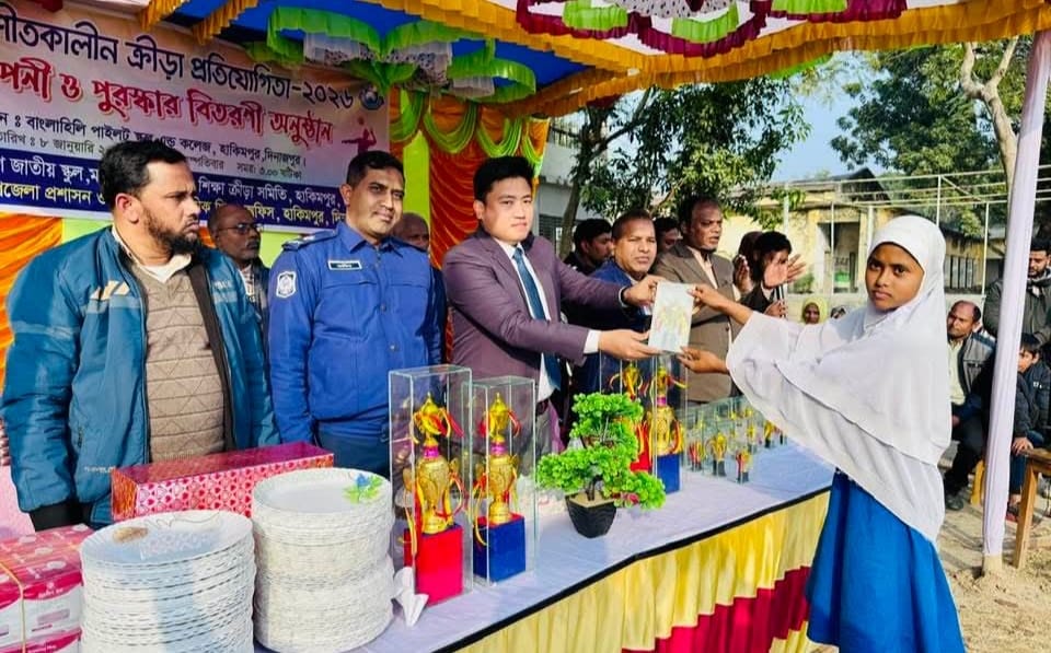 দিনাজপুরের হাকিমপুর উপজেলা প্রশাসন ও মাধ্যমিক শিক্ষা অফিসের আয়োজনে ৫৪'তম জাতীয় স্কুল মাদ্রাসা ও কারিগরি শিক্ষা শীতকালীন ক্রীড়া প্রতিযোগিতার সমাপনী দিনে আলোচনা সভা ও বিজয়ী শিক্ষার্থীদের হাতে পুরস্কার তুলে দেওয়া হয়েছে।