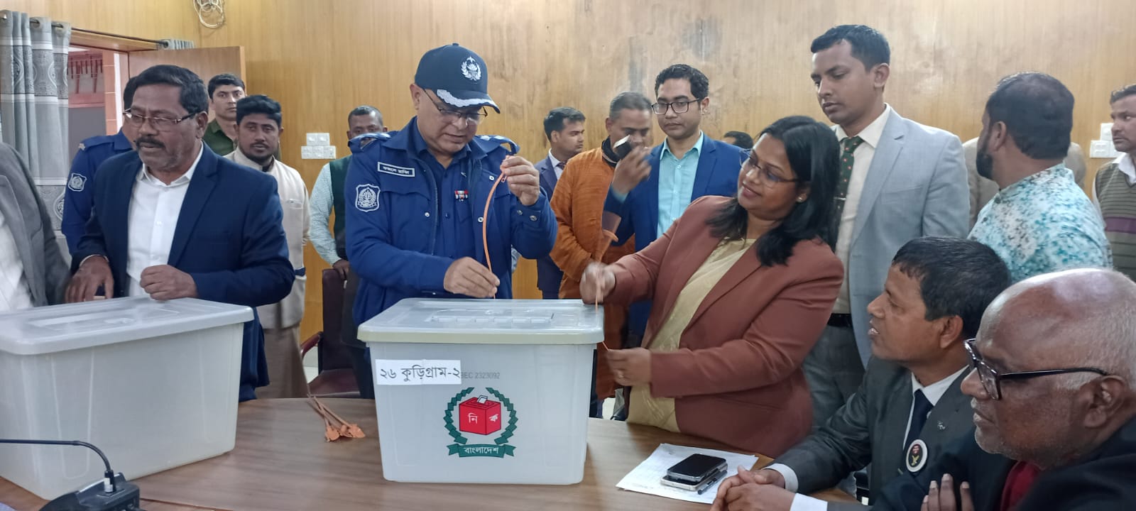 কুড়িগ্রাম থেকে মোস্তাফিজুর রহমান : ২৯ জানুয়ারী ২০২৬, আনন্দঘন পরিবেশে সাংবাদিক ও ভোট প্রার্থী সংসদ সদস্যগণের নিযুক্ত প্রতিনিধিদের উপস্থিতিতে বৃহস্পতিবার ২৯ জানুয়ারী ২০২৬, শেষ বিকেলে কুড়িগ্রাম জেলা প্রশাসক ও জেলা রিটার্নিং কর্মকর্তা অন্নপূর্ণা দেবনাথ'র কার্যালয়ের উত্তরণ সম্মেলন কক্ষে পোষ্টাল ভোট সংরক্ষণের জন্য ১৬টি ভোট বাক্স সিল গালা করা হয়। দেশের অর্থনৈতিক উন্নয়নের চালিকাশক্তি এবং বৈদেশিক মুদ্রা আহরণকারীদের সম্মানে এই প্রথম ভোটাধিকারসহ মৌলিক অধিকার যথাযথ গুরুত্বসহকারে বিবেচনায় নিয়ে প্রফেসর ডক্টর মুহাম্মদ ইউনূসের সরকার কার্যকরী পদক্ষেপ নিয়ে পোষ্টাল ভোটের আয়োজন করে। সরকারী নির্দেশনায় জেলা প্রশাসনের উদ্যোগে উক্ত ভোট সংরক্ষণের জন্য ভোট বাক্স সিল গালা করার আয়োজন করা হয়।
