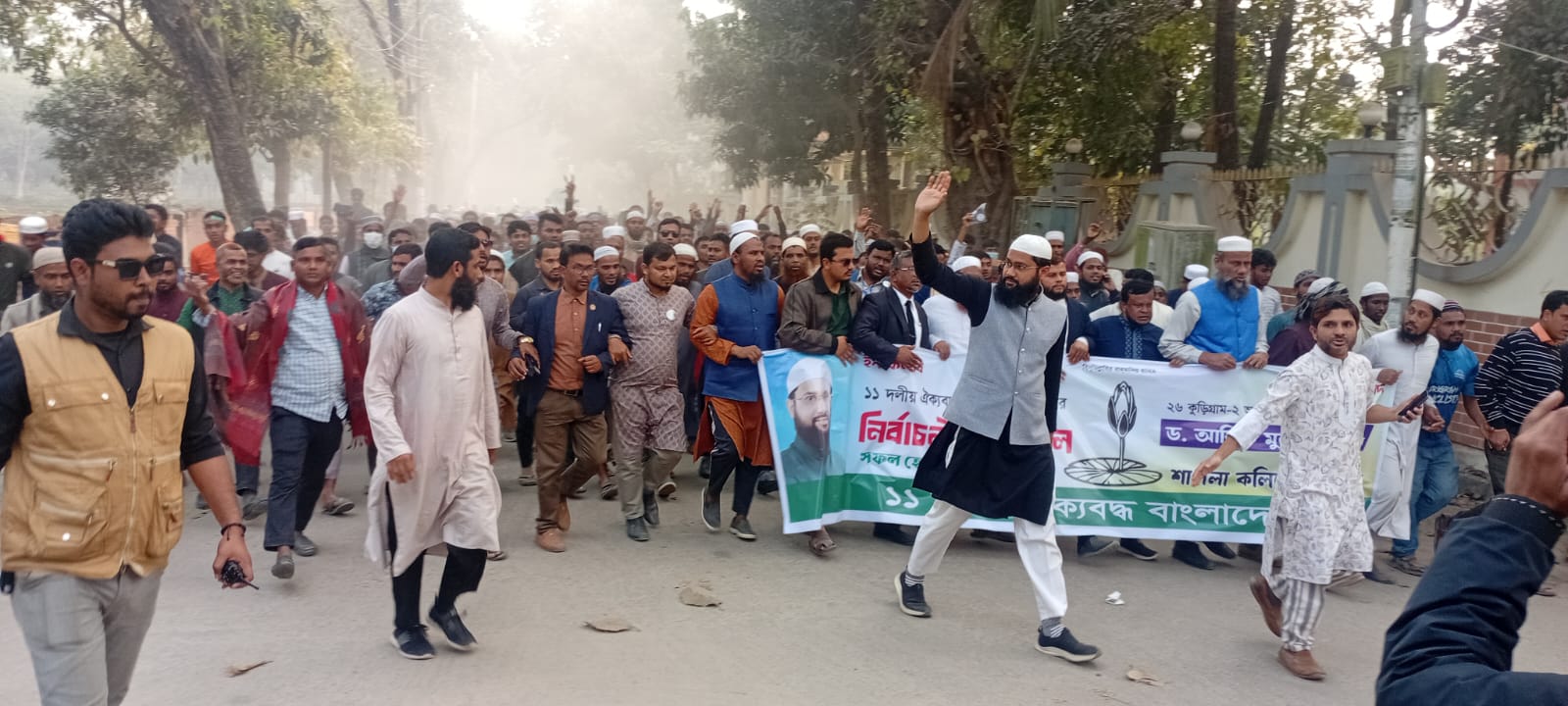 কুড়িগ্রাম থেকে মোস্তাফিজুর রহমান : ০৯ ফেব্রুয়ারী ২০২৬, নির্বাচনী প্রচার প্রচারনার শেষ মুহূর্তে এসে ১১ দলীয় ঐক্য জোট কুড়িগ্রাম দুই আসনের সংসদ সদস্য প্রার্থী জাতীয় নাগরিক পার্টির কেন্দ্রীয় যুগ্ন আহবায়ক ও লাখো তরুণের প্রেরণা ডক্টর আতিক মুজাহিদের নেতৃত্বে বিপুলসংখ্যক জনতার স্বতঃস্ফূর্ত অংশগ্রহণে সর্ববৃহৎ গণ মিছিল কুড়িগ্রামের বিজয়স্তম্ভ থেকে শুরু করে কলেজ মোড় ও জজকোর্ট হয়ে শহরের প্রধান প্রধান সড়ক প্রদক্ষিণ শেষে জুলাই স্মৃতি পাঠাগার চত্বরে মিলিত হয়ে পথসভা অনুষ্ঠিত হয়।গণমিছিল পূর্ব সমাবেশে কুড়িগ্রাম জেলা আইনজীবর সমিতির সাধারণ সম্পাদক এডভোকেট তাজুল ইসলামের পরিচালনায় বক্তব্য রাখেন ডক্টর আতিক মুজাহিদ, কুড়িগ্রাম সদর উপজেলা আমীর মাস্টার শামছুল হুদা মিঠু, সদর উপজেলার সাবেক আমীর মাওলানা ফয়েজ উদ্দিন, কুড়িগ্রাম জেলা শিবিরের সাবেক সভাপতি এডভোকেট জাহাঙ্গীর আলম জুয়েল, খেলাফত মজলিশের রংপুর অঞ্চল পরিচালক শবেবর রহমান,সিরাজুল ইসলাম সিরাজী প্রমূখ।