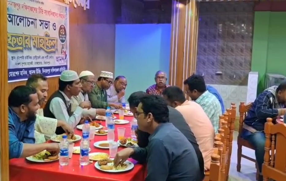 পবিত্র রমজান মাস উপলক্ষে দিনাজপুরের দক্ষিণাঞ্চলে কর্মরত টেলিভিশন সাংবাদিকদের সম্মানে আলোচনা সভা ও ইফতার মাহফিল অনুষ্ঠিত হয়েছে। আনন্দ টিভির উদ্যোগে রবিবার (১ মার্চ ২০২৬) বিরামপুর উপজেলার ঢাকামোড় সুপার মার্কেটস্থ চাংপাই চাইনিজ রেস্টুরেন্ট অ্যান্ড পার্টি সেন্টারে এ আয়োজন করা হয়।