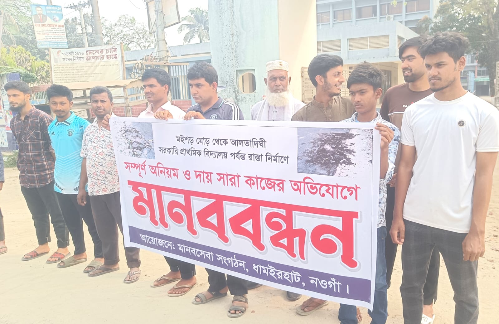 ধামইরহাটে রাস্তা নির্মাণে অনিয়মের প্রতিবাদে ‘মানবসেবা’র ব্যানারে এলাকাবাসীর মানববন্ধন