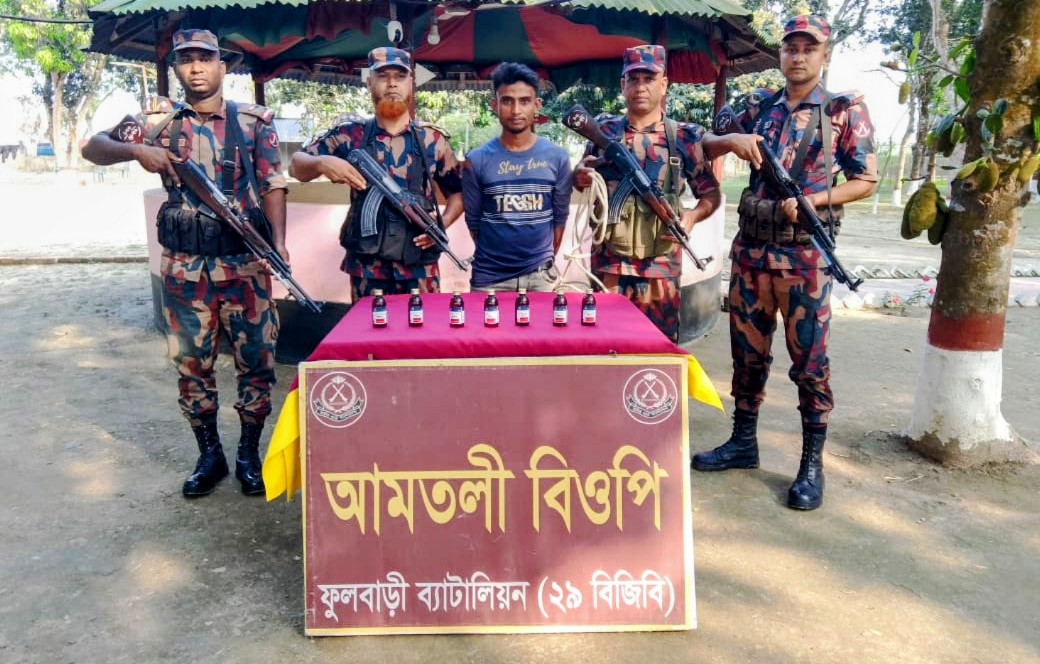 গতকাল বৃহস্পতিবার ফুলবাড়ী ব্যাটালিয়ন (২৯ বিজিবি) এর অধীনস্থ আমতলী বিওপি ও বিরামপুর বিশেষ ক্যাম্প কর্তৃক পৃথক পৃথক ০২টি মাদক ও চোরাচালান প্রতিরোধ অভিযান পরিচালনা করে ০১ জন আসামীসহ ০৭ বোতল ভারতীয় ইস্কফ সিরাপ, ১২০ বোতল বাংলাদেশী যৌন উত্তেজক সিরাপ, ০১টি মোবাইলফোন এবং ০১টি গ্রামীনফোন সিম আটক করতে সক্ষম হয়। আসামীসহ আটককৃত মাদকদ্রব্য ও চোরাচালানী মালামালের সিজার মূল্য ২২,৪০০/- (বাইশ হাজার চারশত) টাকা।