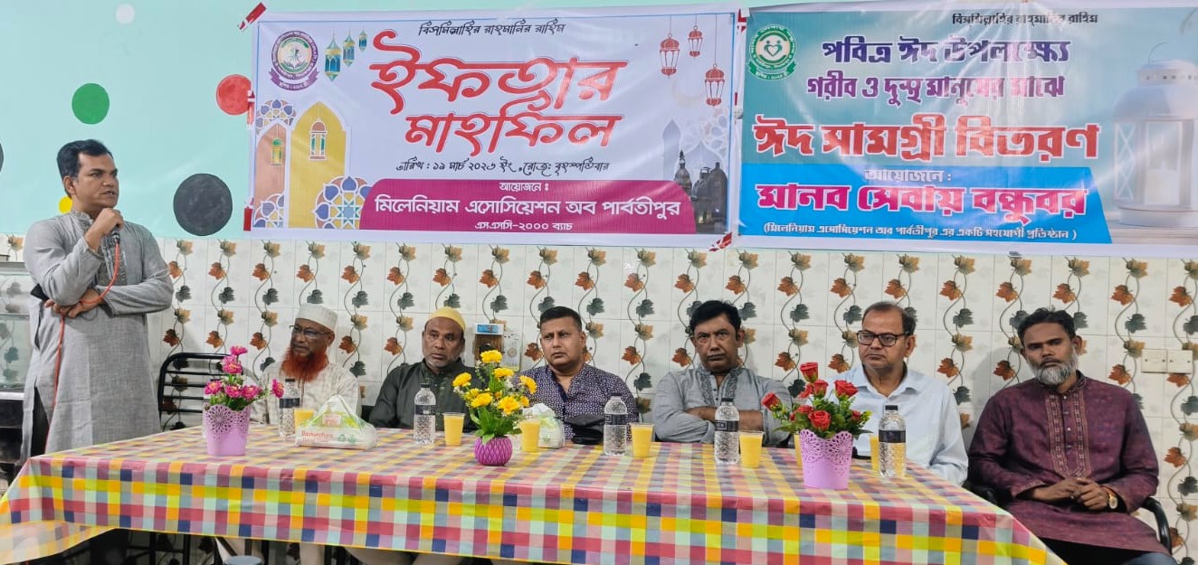দিনাজপুরের পার্বতীপুরে আর্তমানবতার সেবায় নিয়োজিত সামাজিক সংগঠন ‘মিলেনিয়াম এসোসিয়েশন’-এর আয়োজনে পবিত্র মাহে রমজান উপলক্ষ্যে অসহায় ও সুবিধাবঞ্চিত মানুষের মাঝে ঈদ সামগ্রী বিতরণ এবং এক দোয়া ও ইফতার মাহফিল অনুষ্ঠিত হয়েছে।