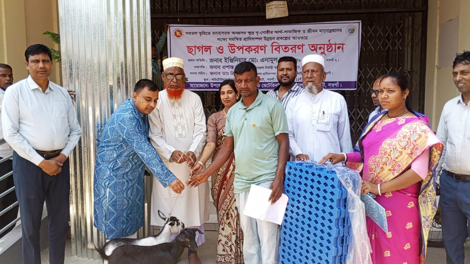 মাসুদ সরকার, ধামইরহাট (নওগাঁ) প্রতিনিধিঃ নওগাঁর ধামইরহাটে সমতল ভূমিতে বসবাসরত অনগ্রসর ক্ষুদ্র নৃ-গোষ্ঠীর আর্থ-সামাজিক ও জীবন মান উন্নয়নের লক্ষ্যে সমন্বিত প্রাণিসম্পদ উন্নয়ন প্রকল্পের আওতায় ছাগল ও উপকরণ বিতরণ করা হয়েছে। ধামইরহাট উপজেলা প্রাণিসম্পদ দপ্তর ও ভেটেরিনারী হাসপাতাল এর আয়োজনে ১১ এপ্রিল সকাল ১০:টায় উপজেলা পরিষদ ভবনের সামনে ছাগল ও উপকরণ বিতরণ কার্যক্রম উদ্বোধন করেন ৪৭ নওগাঁ-২ (ধামইরহাট - পত্নীতলা) আসনের সংসদ সদস্য ইঞ্জিনিয়ার এনামুল হক। এ সময় উপস্থিত ছিলেন উপজেলা নির্বাহী কর্মকর্তা প্রশান্ত চক্রবর্তী, সহকারি কমিশনার (ভূমি) সাজ্জাদ পারভেজ, প্রাণিসম্পদ কর্মকর্তা (অতিরিক্ত দায়িত্ব) রিপা রানী, যুব উন্নয়ন কর্মকর্তা কামরুজ্জামান সরদার প্রমূখ। প্রাণিসম্পদ কর্মকর্তা রিপা রানী জানান, " প্রকল্পের আওতায় ২৫৫ জনের মাঝে ২টি ছাগল, ২টি টিন,৪টি খুঁটি ৫টি ফ্লোরমেট এবং তিন মাসের খাবার বিতরণ করা হচ্ছে। " ছাগল বিতরণ কার্যক্রম উদ্বোধনের পূর্বে উপজেলা পরিষদ অডিটরিয়ামে ক্ষুদ্র নৃ-গোষ্ঠী ও উপকার ভোগীদের মাঝে দিক নির্দেশনা মূলক বক্তব্য রাখেন সংসদ সদস্য ইঞ্জিনিয়ার এনামুল হক।