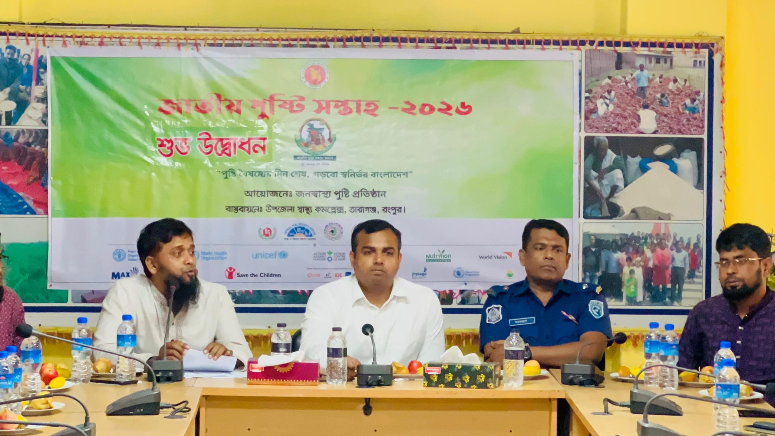 রংপুরের তারাগঞ্জ উপজেলায় যথাযোগ্য মর্যাদায় পালিত হয়েছে জাতীয় পুষ্টি সপ্তাহ-২০২৬। বৃহস্পতিবার (২৩ এপ্রিল) “পুষ্টি বৈষম্যের দিন শেষ, গড়বো স্বনির্ভর বাংলাদেশ” এই প্রতিপাদ্যকে সামনে রেখে উপজেলা প্রশাসন ও স্বাস্থ্য বিভাগের উদ্যোগে দিনব্যাপী নানা কর্মসূচির আয়োজন করা হয়।
