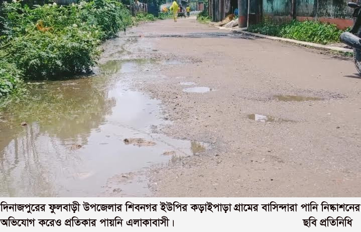 দিনাজপুরের ফুলবাড়ী উপজেলার শিবনগর ইউপির কড়াইপাড়া গ্রামের বাসিন্দারা পানি নিষ্কাশনের অভিযোগ করেও প্রতিকার পায়নি এলাকাবাসী। ফুলবাড়ী উপজেলার শিবনগর ইউপি কড়াইপাড়া গ্রামে ৭ নং ওয়ার্ডের এলাকাবাসী বারবার অভিযোগ করার পরও প্রতিকার পায়নি এলাকাবাসী এমন অভিযোগ করেছেন ভুক্তভোগীরা। দিনাজপুরের ফুলবাড়ি উপজেলার শিবনগর ইউনিয়নের ৭ নম্বর ওয়ার্ডে কড়াইপাড়া জামে মসজিদ রোডের পানি নিষ্কাশন ব্যবস্থা না থাকায় রাস্তায় ময়লা পানি এসে জমে থাকায় রাস্তাটি খাল খন্দে পরিণত হয়েছে। স্থানীয় সরকার প্রকৌশলী অধিদপ্তর ফুলবাড়ী (এলজিইডি) থেকে গত কয়েক বছর আগে রাস্তাটি নির্মাণ করা হয়। কিন্তু রাস্তার দুই পাশে ড্রেন না থাকায় গ্রামবাসীদের বাসাবাড়ির পানি রাস্তার উপরে দীর্ঘদিন ধরে জমে থাকার কারণে রাস্তাটি নষ্ট হয়ে যাচ্ছে। এতে স্থানীয় জনসাধারণ যাতায়াতের চরম ভোগান্তির মধ্যে পড়ছে।এই রাস্তাটি দিয়ে ৯ নং হামিদপুর ইউনিয়নে এলাকাবাসি ও খয়েরপুকুর হাটের শত শত লোকজন এই রাস্তাটি দিয়ে চলাচল করে আসছে। স্থানীয় মুদি দোকানদার মহিদুল ইসলাম বলেন, এ পর্যন্ত ১০/১২ বার ৭নং শিবনগর ইউনিয়ন চেয়ারম্যান মোঃ ছামেদুল ইসলামকে লিখিত অভিযোগ করেছি কোন কাজ হয়নি। তারপর উপজেলা প্রশাসন কে বলার পরও কয়েক বছর ধরে এই অবস্থা আমরা মসজিদে যেতে পারছিনা এই নোংরা পানি ভেঙে। পথচারি নজরুল বলেন, আমরা প্রতিদিন এই রাস্তায় চলাচল করি কিন্তু এই ময়লা পানি কাপড়ে লেগে কাপড় অপবিত্র হয়ে যায় পরবর্তীতে কাপড় পরিবর্তন করে মসজিদে যেতে হয়। এদিকে ৯ নং হামিদপুর ইউনিয়ন পরিষদে চেয়ারম্যান আলহাজ্ব রেজওয়ানুল হক জানান আমার এলাকার কয়েক হাজার জনগণ এই রাস্তা দিয়ে চলাচল করে। রাস্তাটির বেহাল অবস্থা ও রাস্তার উপরে পানি জমে থাকার কারণে চলাচলে দূর্ভোগে পড়তে হয়।